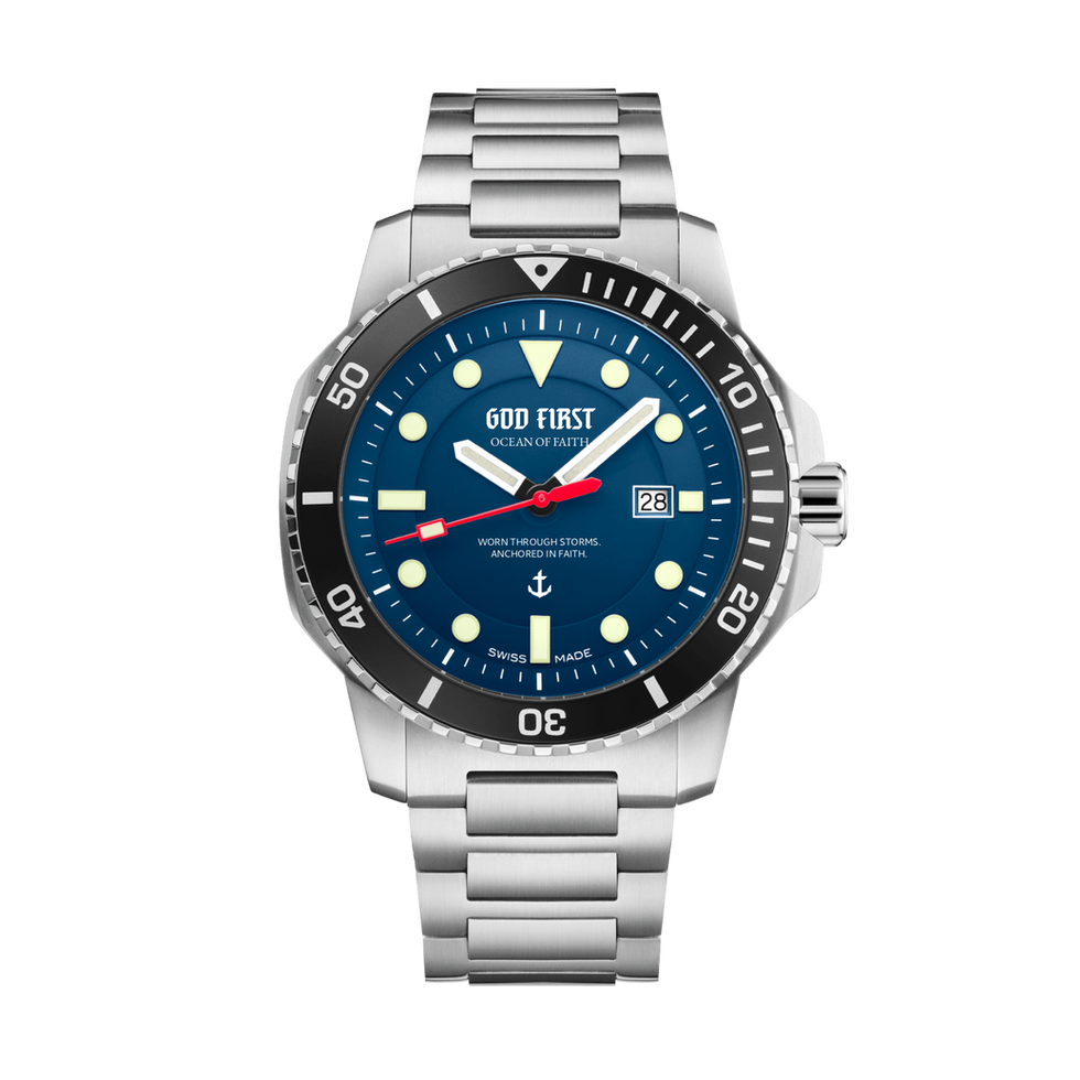 Tauche ein in die Tiefe des Glaubens. Die „OCEAN OF FAITH“ mit ihrem tiefblauen Zifferblatt verbindet Schweizer Präzision mit einer starken Botschaft: Gott steht an erster Stelle. Gefertigt aus hochwertigem Edelstahl, mit Schweizer Uhrwerk angetrieben durch Solar Technologie und markantem Design – geschaffen für alle, die Stil und Bedeutung vereinen.